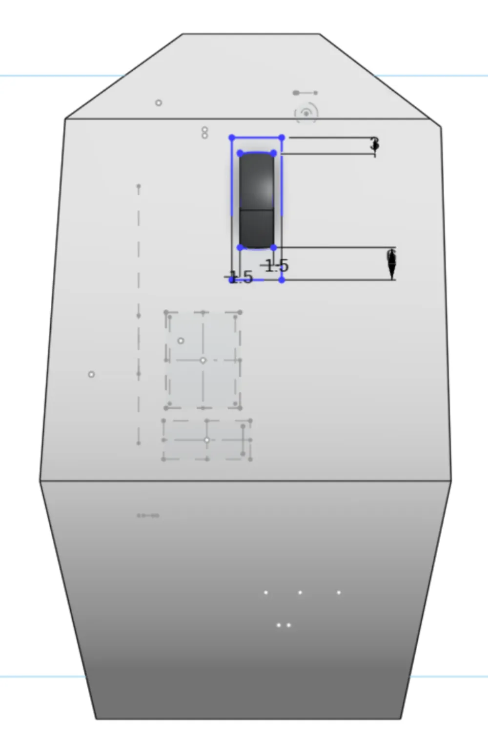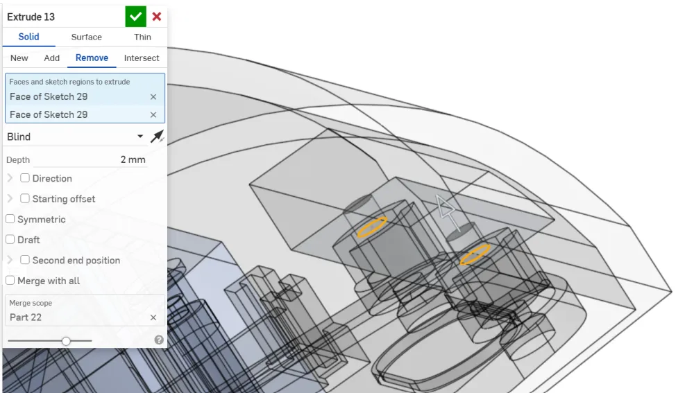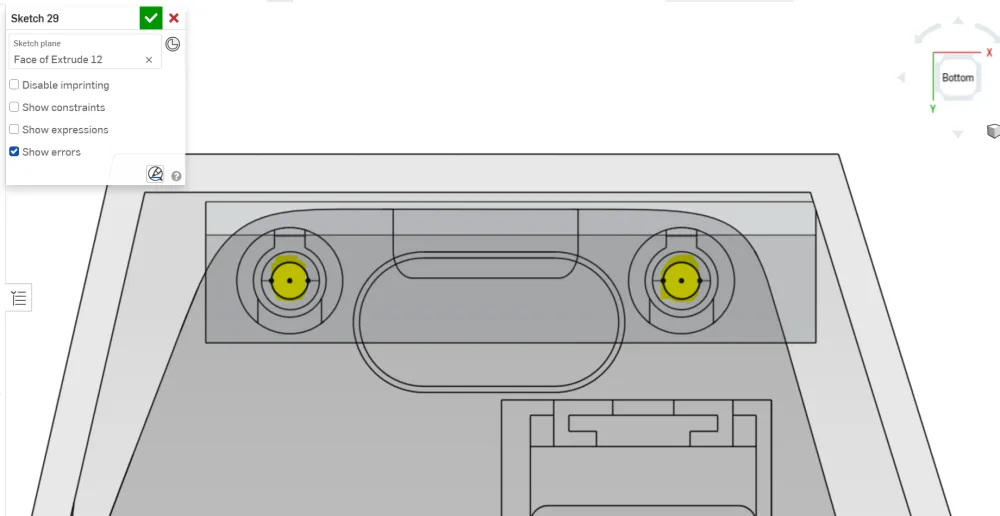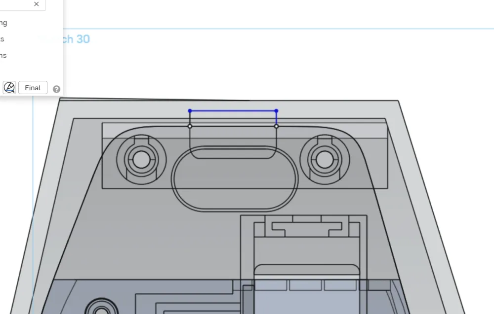 Start a new sketch on the top face for the clickers. Remove to form a through hole: