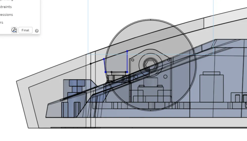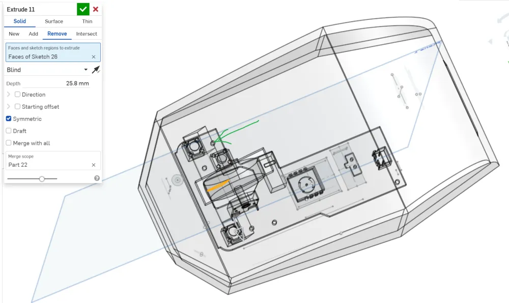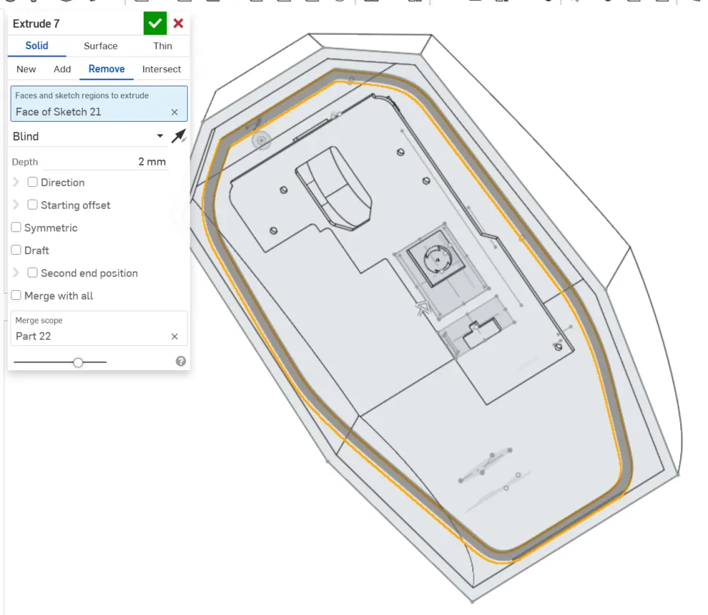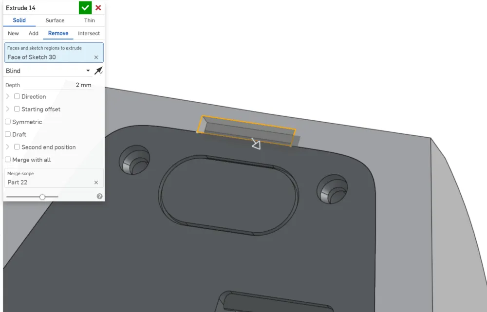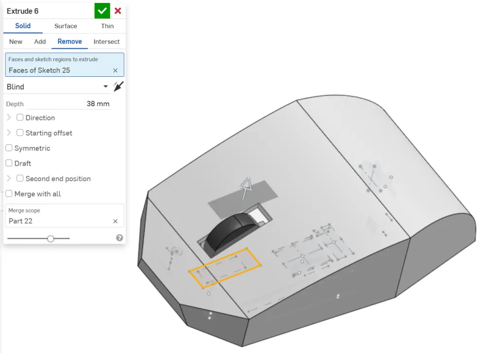 Start a new sketch on the top face for the clickers. Remove to form a through hole: