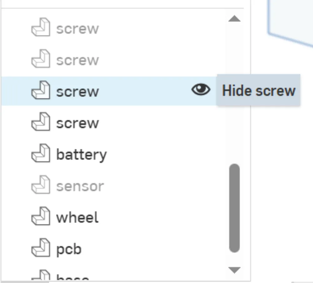 Hide all unnecessary parts except for mid, screw4, screw5, wheel, pcb, and base: